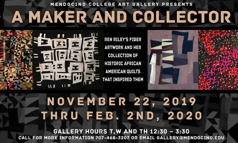 The community is invited to attend the upcoming Mendocino College Art Gallery exhibit A Maker and Collector by artist Ren Riley. A show of Riley’s fiber artworks will be shown alongside a selection of her collection of historic American quilts. The exhibit will kick off with a Gala on Friday, November 22 beginning at 5 pm, prior to the opening show of Arise, a dance performance by the Mendocino College Repertory Dance Company. Refreshments will be served.