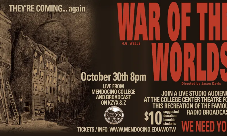 From the creative mind of Mendocino College Theatre Faculty Stephen Decker comes a radio reproduction of HG Wells’ War of the Worlds. Directed by Mendocino College faculty Jason Davis, this project is a collaboration between KZYX, the Mendocino College Recording Arts Club and the Little Theatre Club.